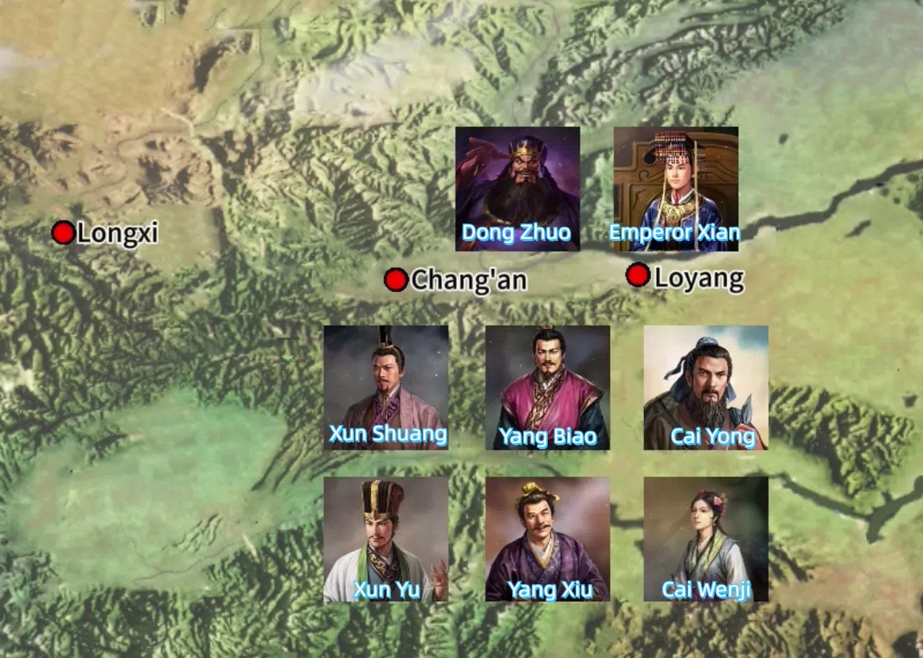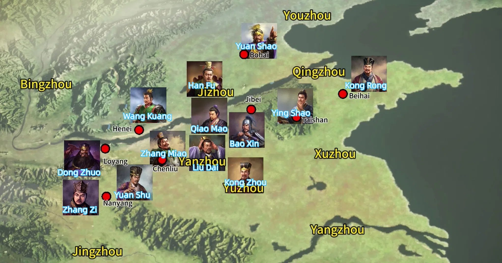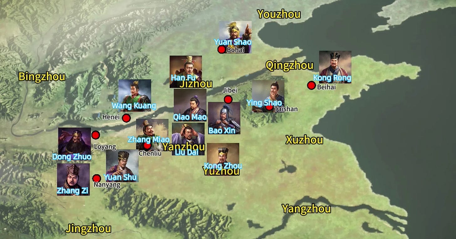 At the same time, Dong Zhuo also selected a large number of famous scholars to serve as local governors and other important positions, such as: Han Fu(韩馥) as the Provincial Governor of Jizhou(冀州), Liu Dai as the Provincial Governor of Yanzhou(兖州), Kong Zhou(孔伷) as the Provincial Governor of Yuzhou(豫州), Zhang Zi(张咨) as the Commanderial Governor of Nanyang , Kong Rong as the Commanderial Governor of Beihai(北海), Ying Shao(应劭) as the Commanderial Governor of Taishan(泰山), and Zhang Miao(张邈) as the Commanderial Governor of Chenliu.