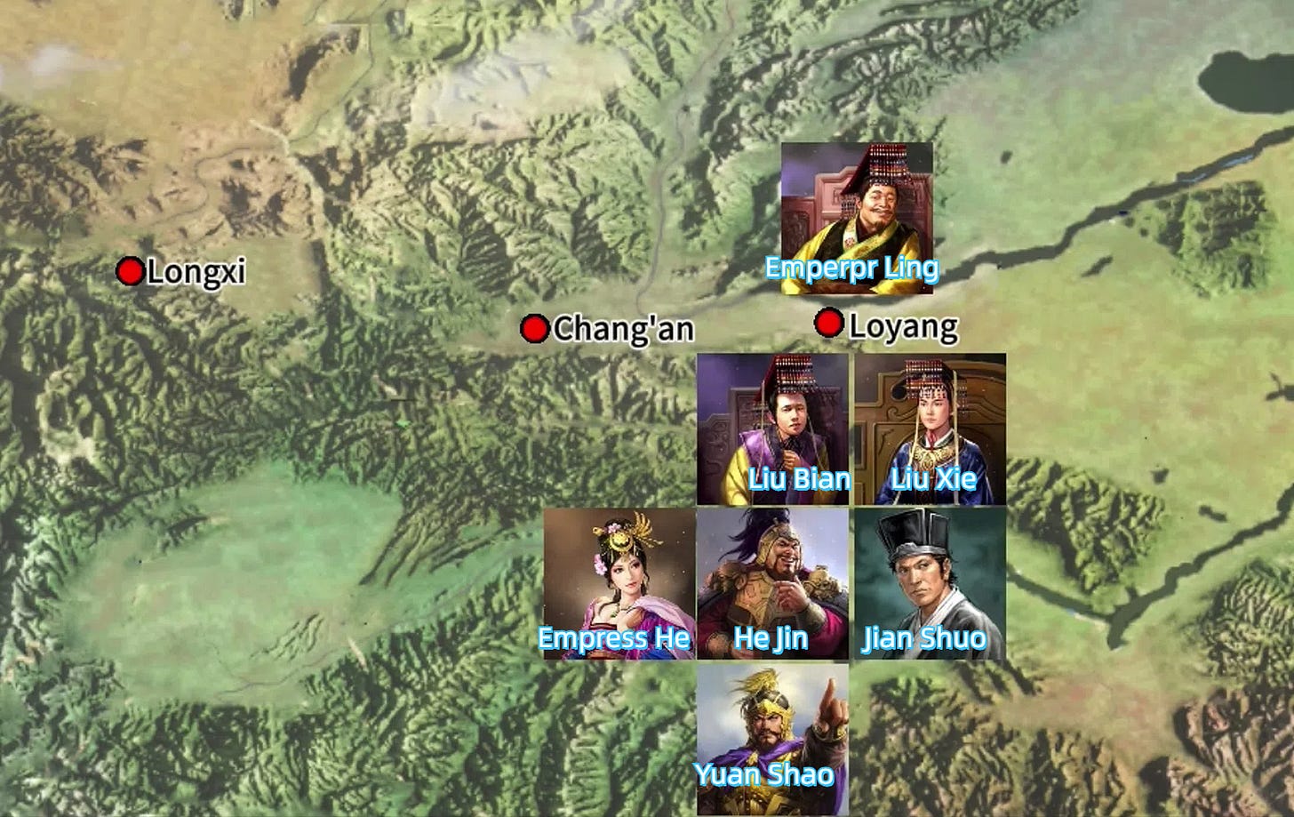 In April 189 A.D., at the age of 33, Liu Hong, the Emperor Ling of Han, died in Lo yang. Liu Hong's death shattered the already weak balance between the two factions Jian Shuo wanted to lure He Jin into the palace and kill him to support Liu Xie's ascension to the throne, but the plan was leaked and He Jin escaped, so Liu Bian, the eldest and legitimate son , at the age of 14, was able to ascend to the throne ,who is called the Emperor Shao of Han(189AD汉少帝).