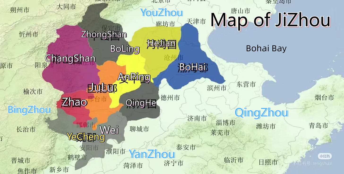 At the late Eastern Han, there were 10 commanderies in Jizhou, namely: Anping安平, Zhongshan中山, Boling博陵 , Changshan常山,HeJian河间, Qinghe清河, Zhao赵, Julu巨鹿, Bohai渤海, and Wei魏.