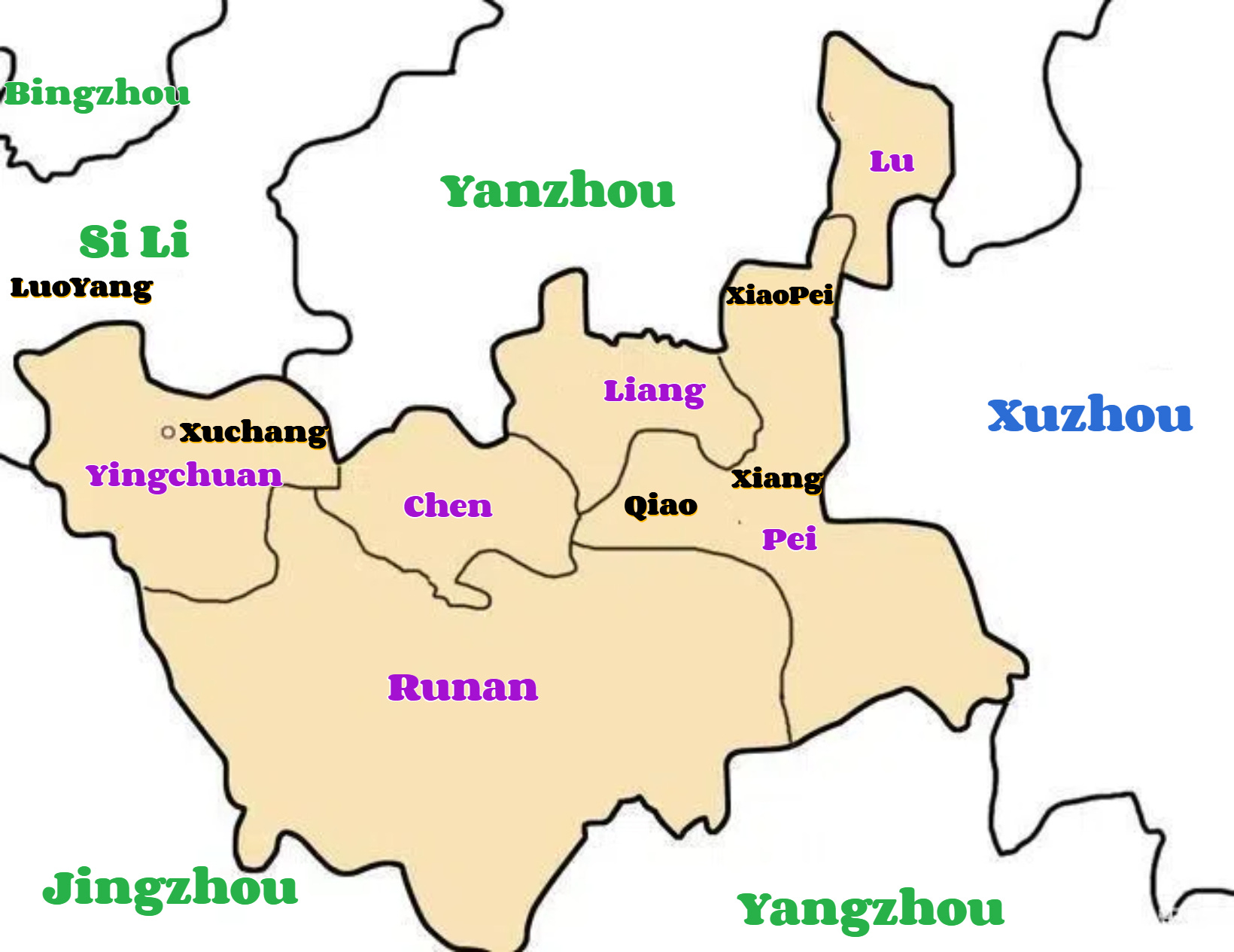 During the Eastern Han Dynasty, there were six Commanderies in Yuzhou, namely:Pei沛,Chen陈, Lu鲁 , Liang梁 , YingChuan颍川,RuNan汝南.