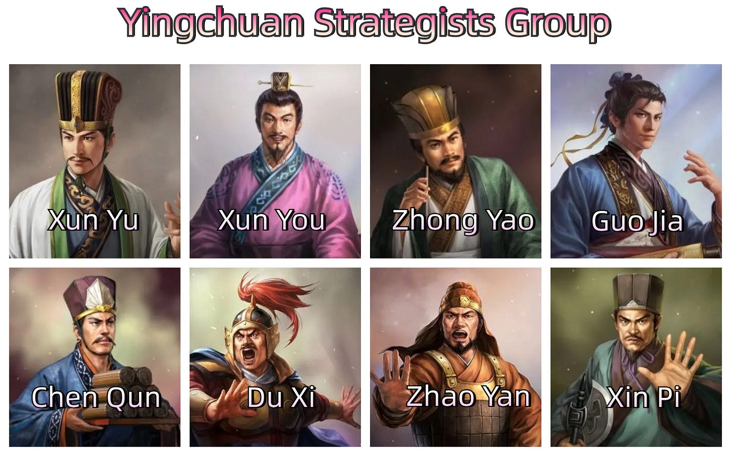 Cao Cao made Xu County his early headquarters and greeted the emperor here, largely because most of his civil ministers came from Yingchuan Commandery, led by Xun Yu, who later became known as the "Yingchuan Strategists Group". They included Xun Yu荀彧, Xun You荀攸, Zhong Yao钟繇, Guo Jia郭嘉, and the "Four Great scholars of Yingchuan" Chen Qun陈群, Zhao Yan赵俨, Du Xi杜袭, and Xin Pi辛毗.