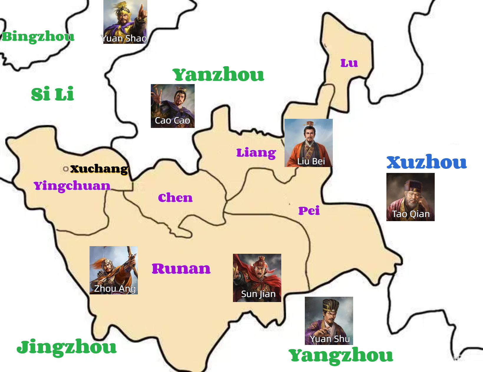 If you are talking about the complexity of the situation, Yuzhou豫州 province to the south of Yanzhou can be said to be second only to Yanzhou. It was sandwiched between the forces of Yuan Shao袁绍, Cao Cao, Tao Qian陶谦, Yuan Shu袁术, Liu Biao刘表 and other factions, and the war here was constant.