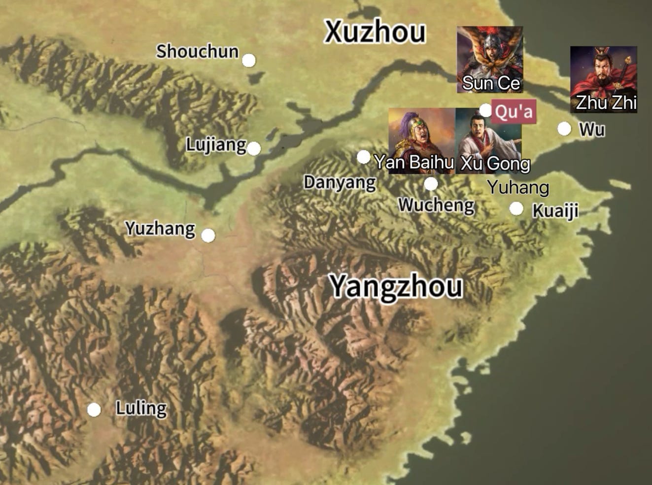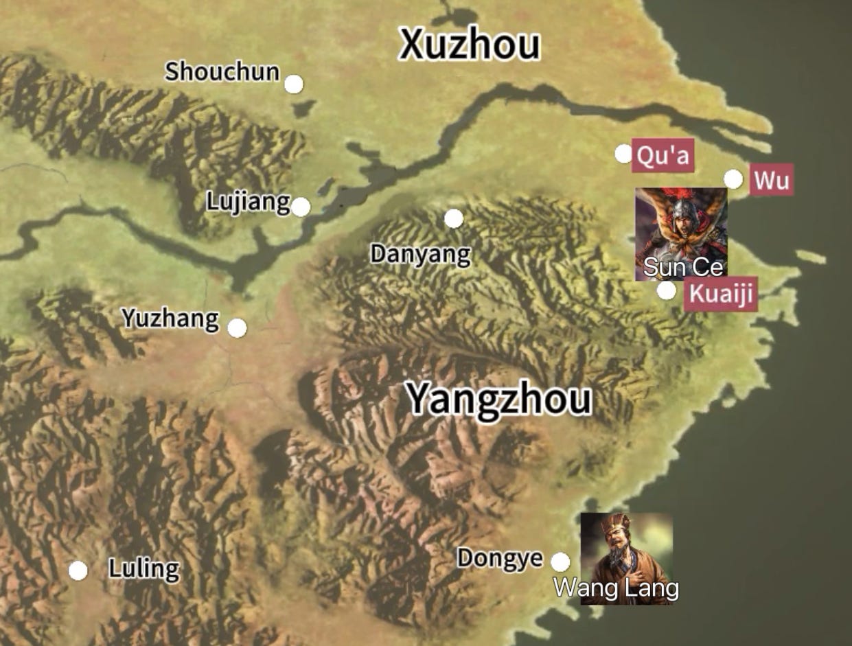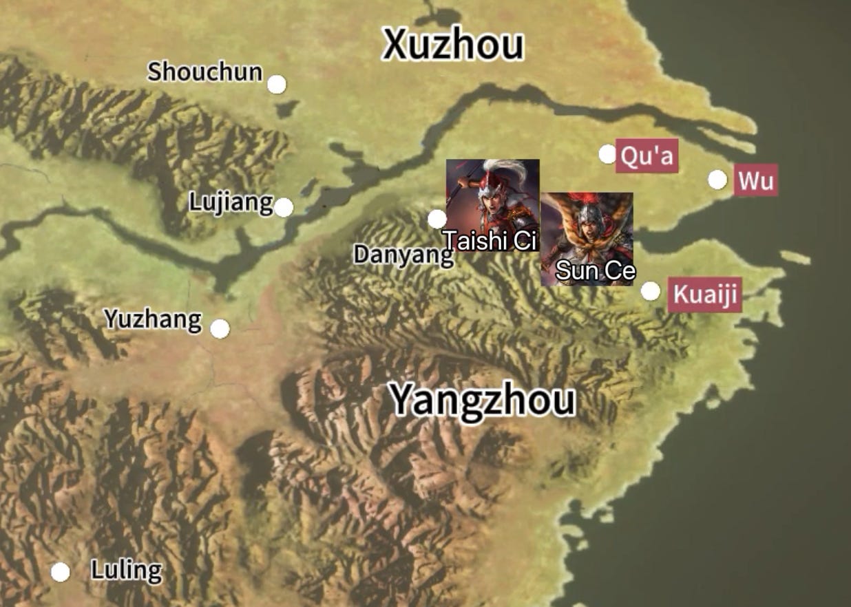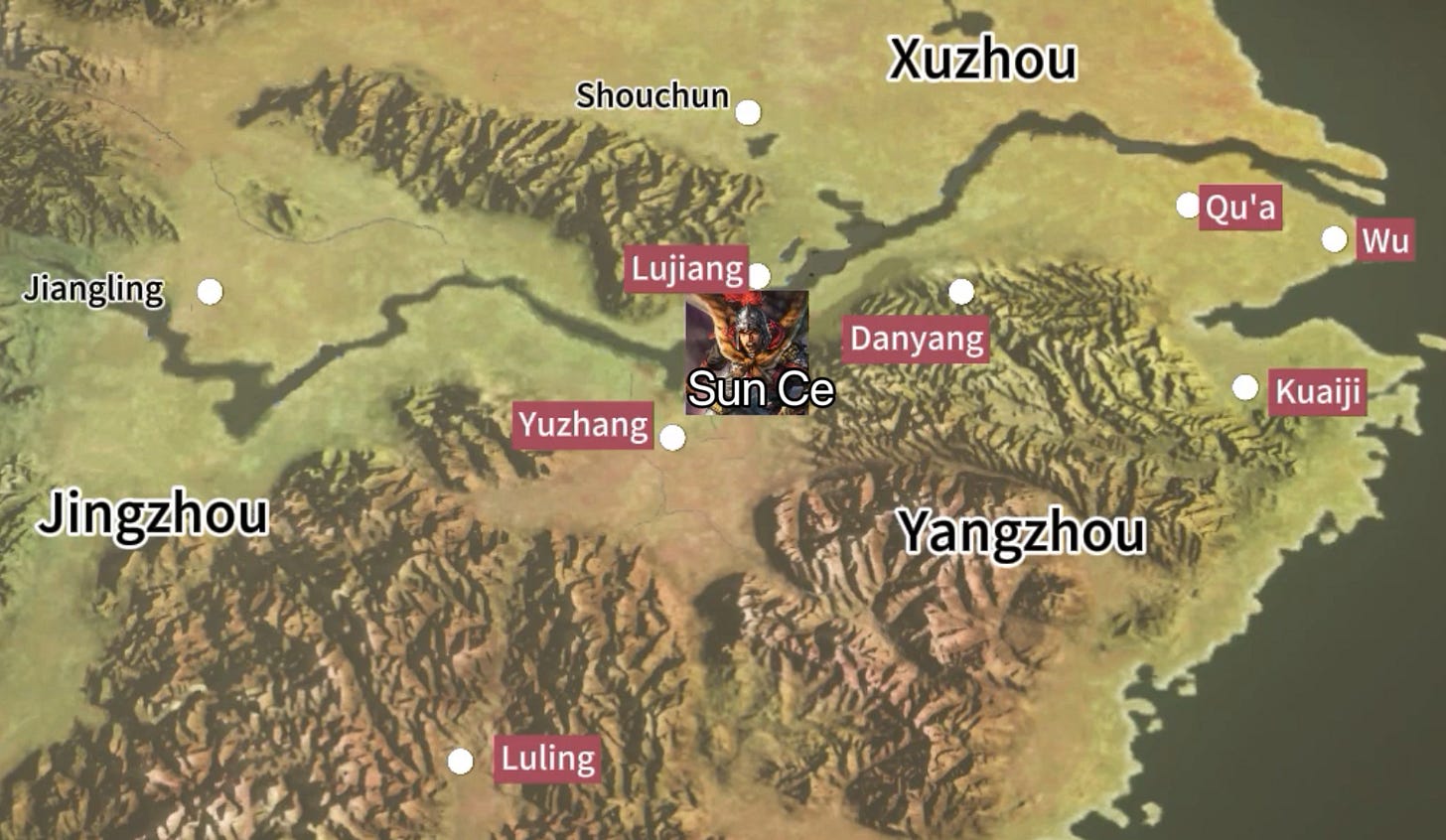 At this time, Sun Ce already owned three commanderies in Jiangdong(to the east of Yangtze River), including Wu, Kuaiji and Danyang.