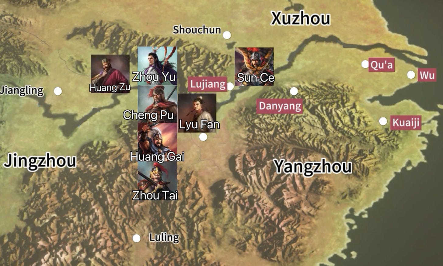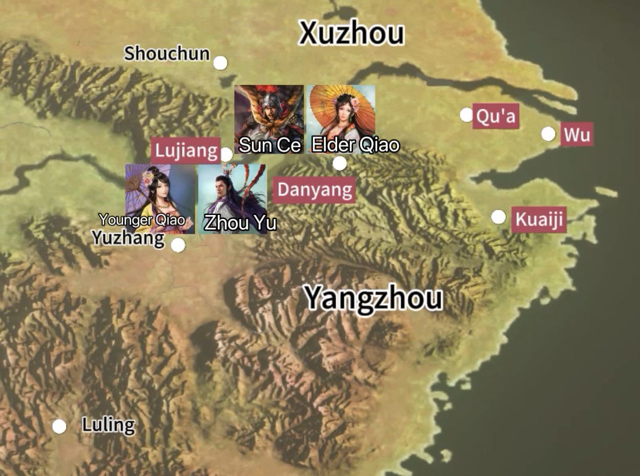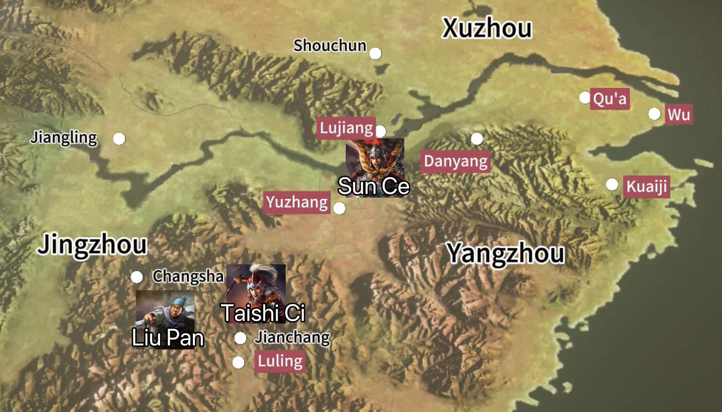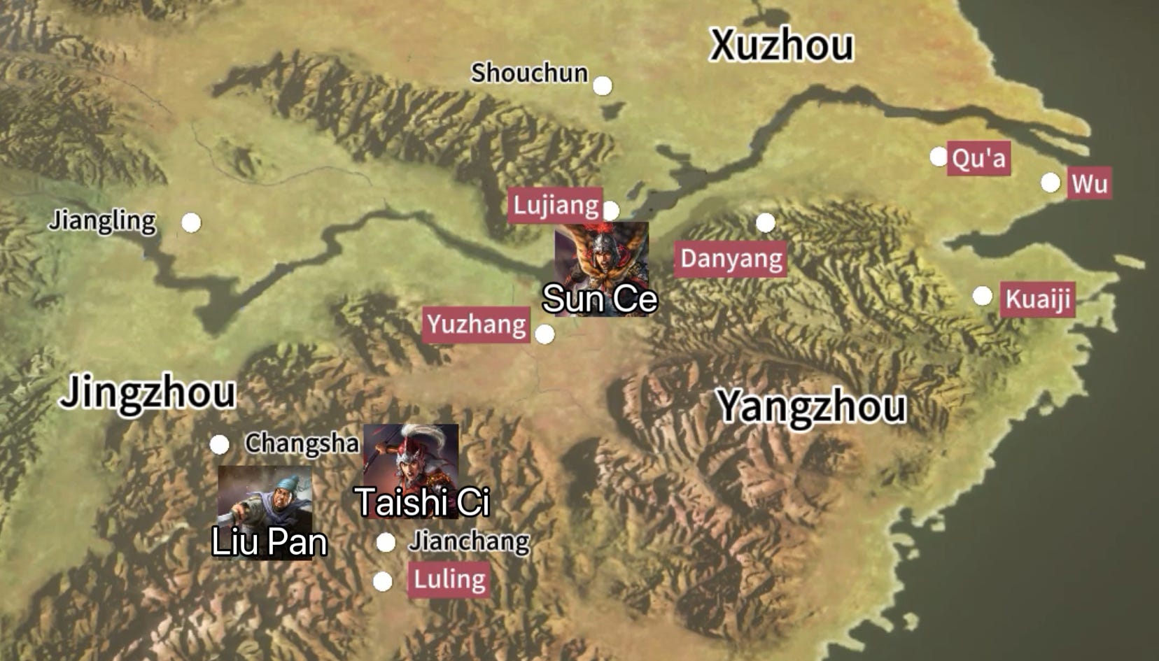 At this time, Sun Ce already owned three commanderies in Jiangdong(to the east of Yangtze River), including Wu, Kuaiji and Danyang.