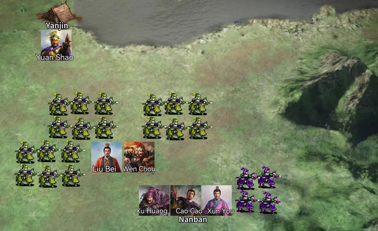 When Yuan Shao arrived in Yanjin, he learned that Cao Cao had just withdraw, so Yuan Shao led his army to temporarily station in the south of Yanjin, and sent Liu Bei and his general Wen Chou文丑 to lead five or six thousand cavalry to continue the pursuit.