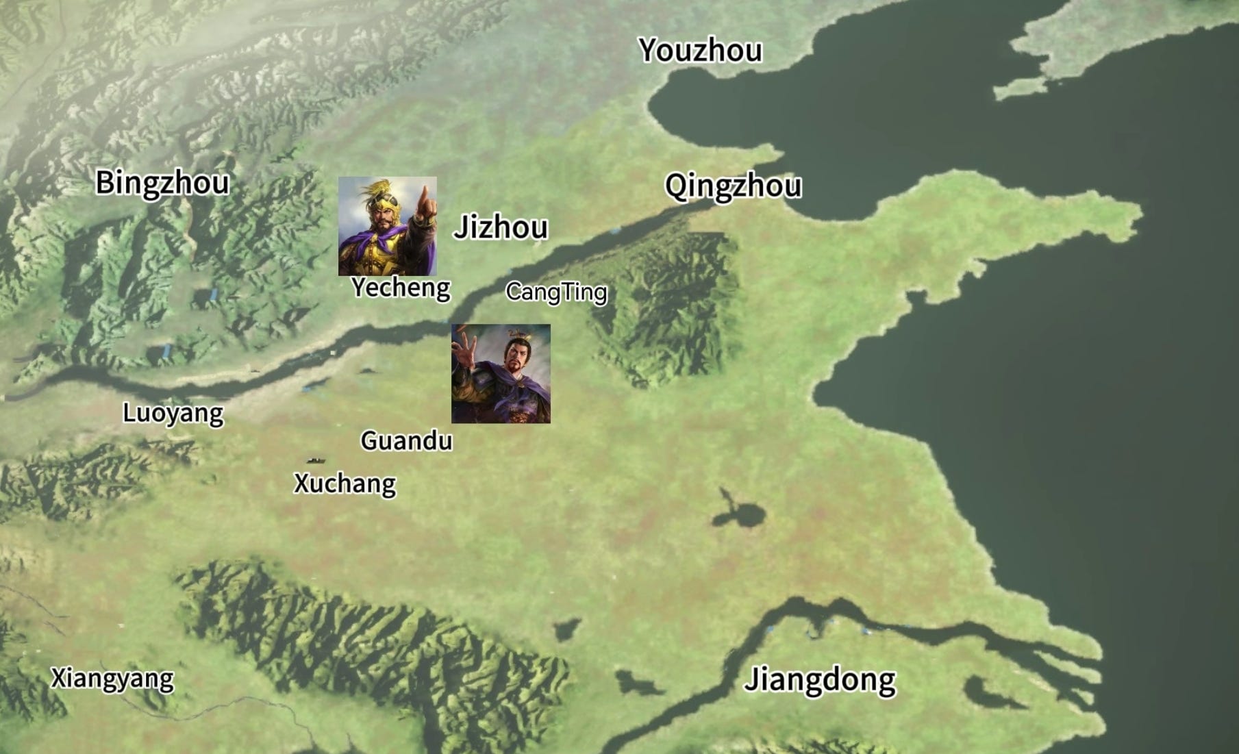 After the victory of GuanDu,Cao Cao marched into Cangting仓亭 on the north bank of Yellow River and drove all Yuan Shao's defenders around Cangting area to the north of the Yellow River,in April 201AD. After this, Yuan and Cao respectively ruled the north and south banks in the middle and lower reaches of the Yellow River.