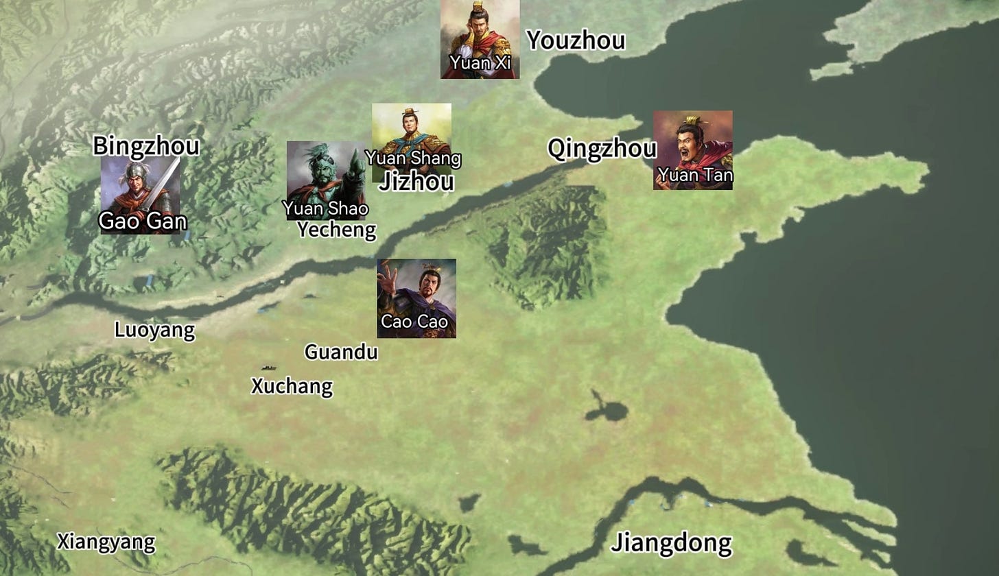 Yuan Shao had appointed Yuan Tan as the Provincial Governor of Qingzhou青州,appointed Yuan Xi as the Provincial Governor of Youzhou幽州, and his nephew Gao Gan高干 as the Provincial Governor of Bingzhou并州,only kept Yuan Shang by his side, obviously wanting to leave the family business to his youngest son.