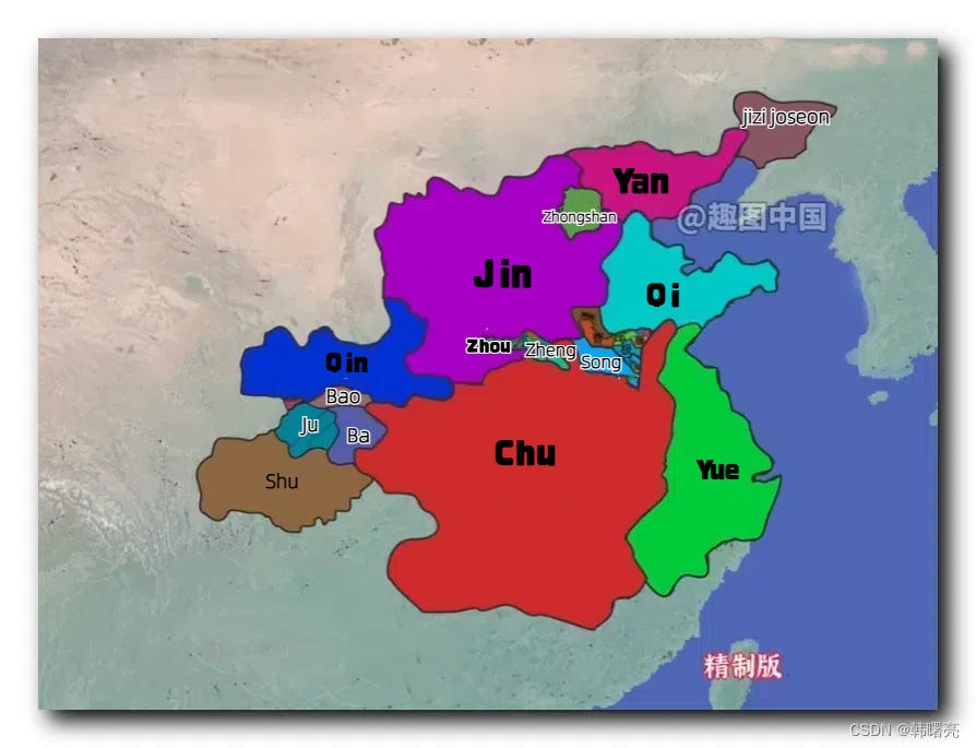 The map above shows the territory of Jin at its zenith. Compare this with the pitifully small domain of Qin during the same period.